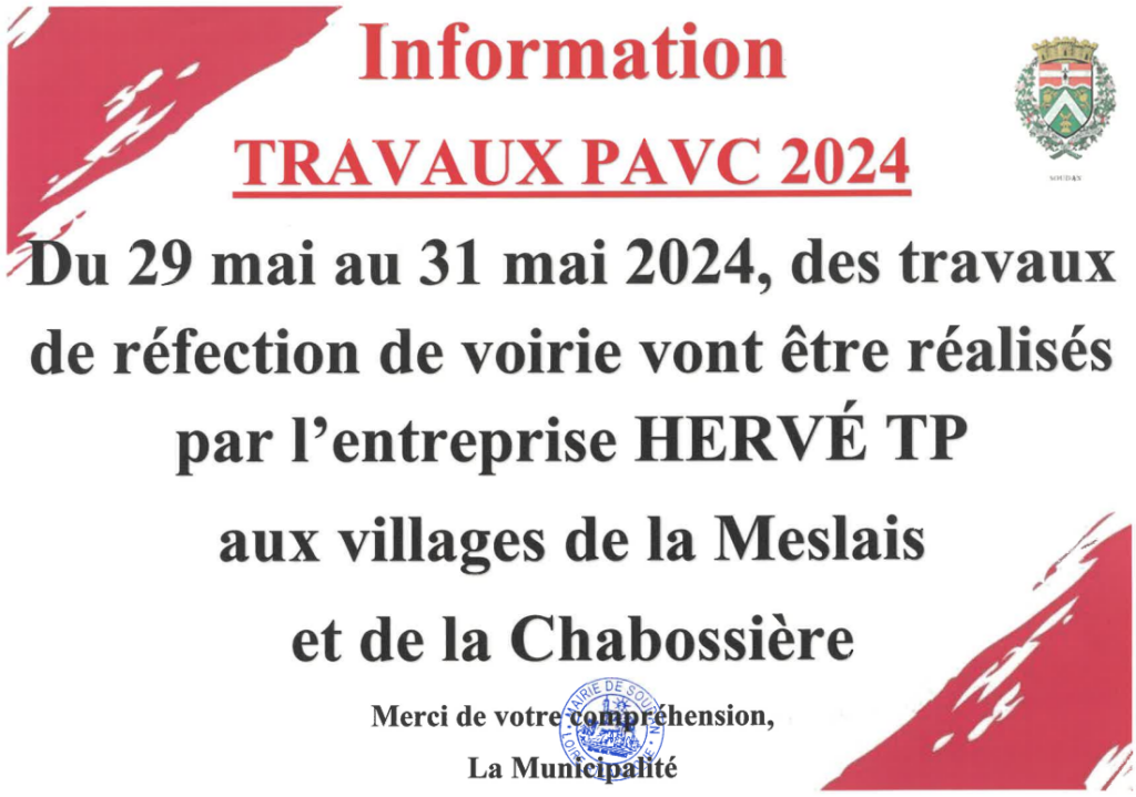 du 29 mai au 31 mai 2024, des travaux de réfection de voirie vont être réalisés par l’entreprise HERVÉ TP aux villages de la Meslais et de la Chabossière.