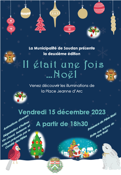 La Municipalité de SOUDAN organise pour la deuxième édition “Il était une fois…Noël le vendredi 15 décembre 2023 à partir de 18h30 – Place Jeanne d’Arc.