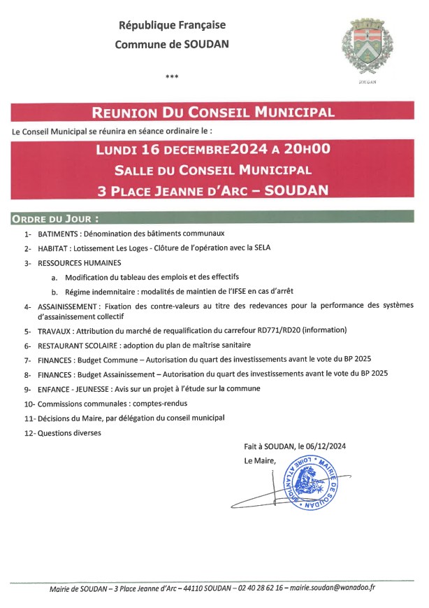 La prochaine réunion du Conseil Municipal est prévue le lundi 16 décembre 2024 à 20h00 – Salle du Conseil Municipal