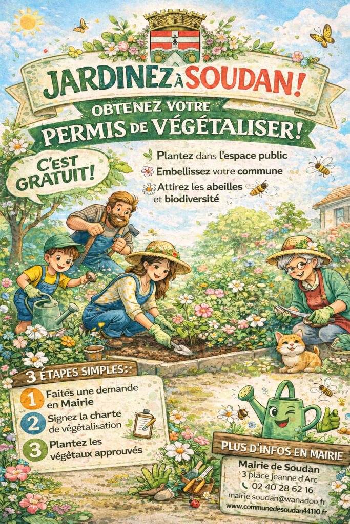 La Ville de Soudan souhaite encourager le développement de la végétalisation du domaine public en s’appuyant sur une démarche participative et une forte implication des habitants, des associations, des commerçants… afin de :